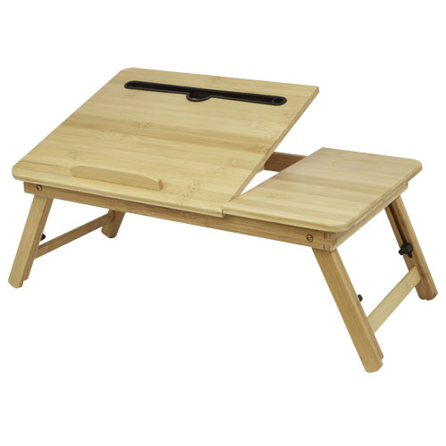 Foldable and adjustable desk made from bamboo. This versatile desk allows for adjusting the height but also the angle for reading books, working on a laptop, watching movies on a tablet, or to enjoy a nice meal. The fixed side table is suitable for a cup, computer mouse and/or notebook. Ideal to use on the couch, in the garden, in bed, on the balcony or in the park. The bamboo used is from sustainable, environmentally and socially responsible sources. The foldable desk in the highest position has a size of 68.5 x 34 x 48 cm. Comes with an instruction manual and is packed in a recycled cardboard gift box with a size of 58 x 36 x 5.5 cm.