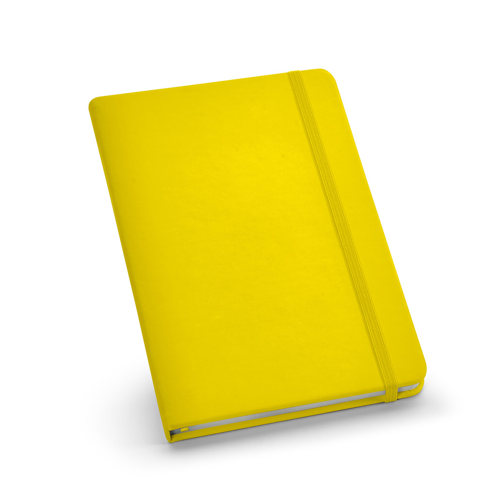 A5 notepad with 160 plain pages, imitation leather hardcover, bookmark ribbon and elastic band. 140 x 210 mm