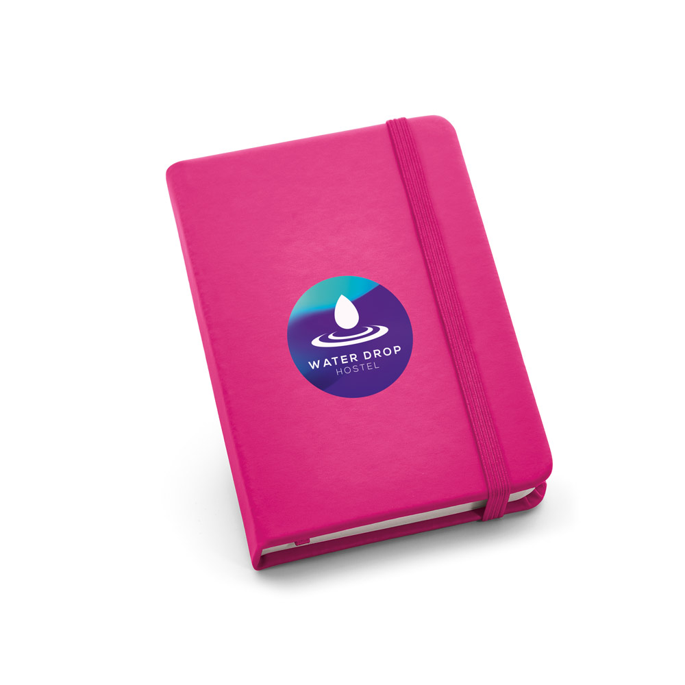 Pocket sized notepad with 160 plain pages,imitation leather hardcover, bookmark ribbon and elastic band. 90 x 140 mm