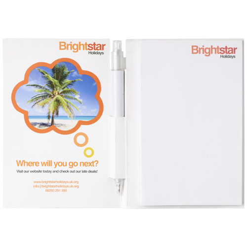 Essential conference pack A5. Includes an A5 notepad with 50 sheets (80g/m2) blank paper and a calypso pen in the spine area. The conference pack has a hard cover (350g/m2). Full colour decoration possible on both sides of the cover, as well as on each sheet.