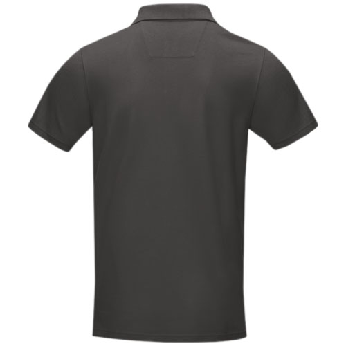Sustainable promotional apparel. Sustainable metal buttons. Hidden three button placket. Flat knit collar. Bi-coloured branded necktape. Side slits with bi-coloured branded tape finishing. Half moon. Heat transfer main label for tagless comfort.