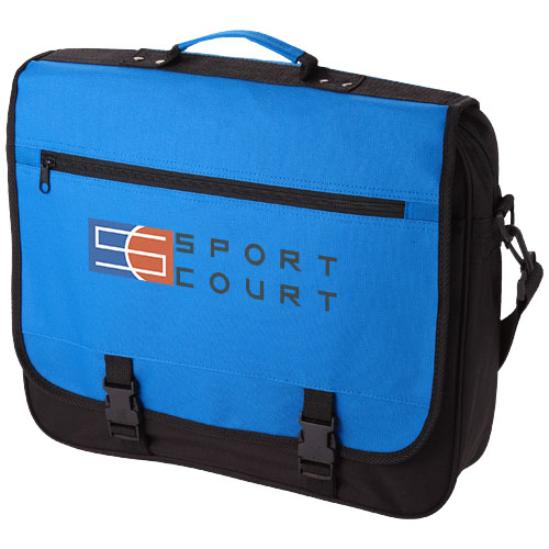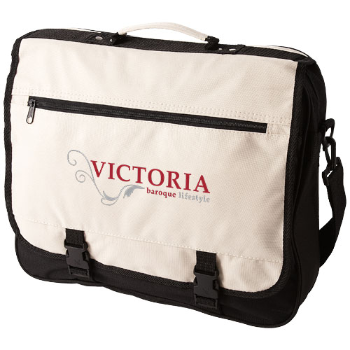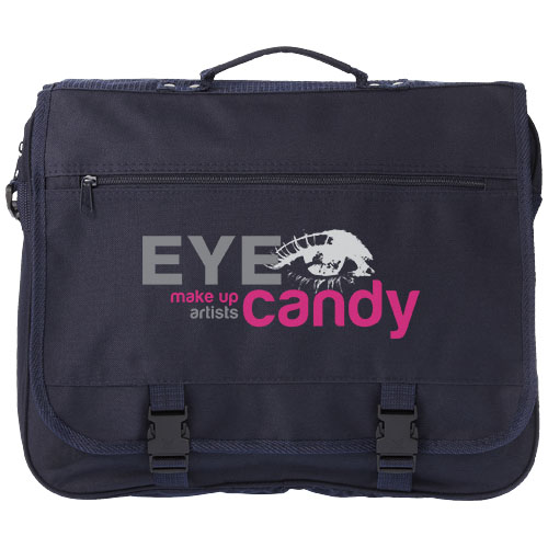 Exhibition bag with adjustable shoulder strap, buckle closure flap, zipper pocket in flap, zippered main compartment and several open pockets under flap.