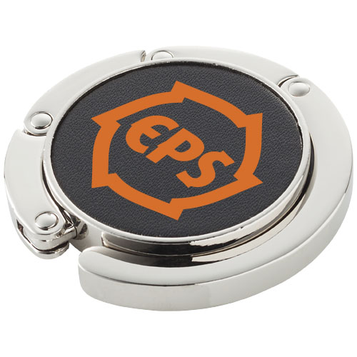 Foldable bag hanger which keeps a bag clean and safe. Hanger can be attached at the edge of a surface and can hold up to 4.5kg. Including black gift box.