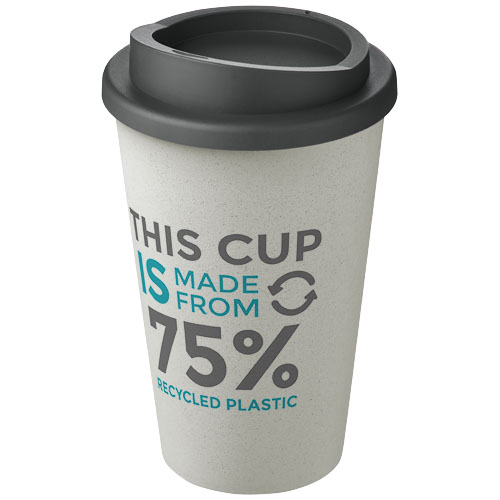 Double-walled insulated tumbler with twist-on lid. The tumbler is made of 100% recycled PP Plastic, and the lid is made of food grade PP Plastic. Since the lid is not made of recycled material it can be ordered in a wide range of different colours. The shade of black on the tumbler may vary due to the nature of the recycled material. Volume capacity is 350 ml. Made in the UK. Packed in home compostable bag.
