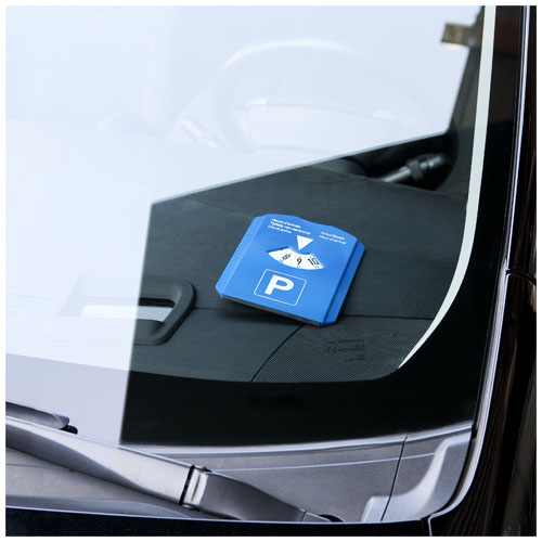 Parking disk with an ice scraper, rubber wiper, trolley coin and tire tread depth gauge. Disk has a large white logo area on the back. “Hour Of Arrival” text on disk cover listed in Dutch, English, French, German and Italian. Regulations may vary locally.