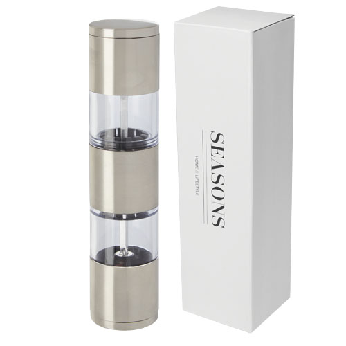 2-sided grinder with one end for salt and the other for pepper. Pepper and salt are not included.