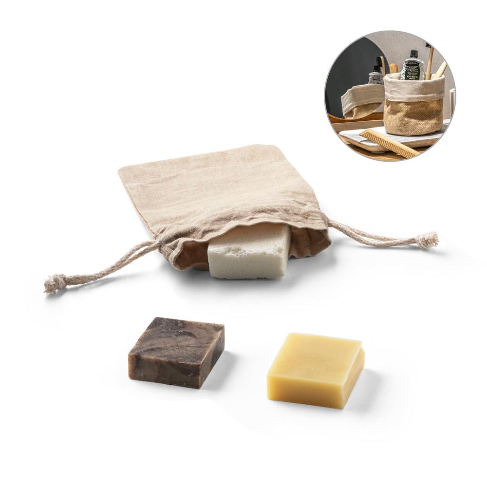 Soap set composed of two soaps and one solid vegan and handmade shampoo of natural origin. Ideal for creating a relaxing spa-like environment. Made with olive oil, natural ingredients and essential oils. The set includes: natural soap (50g): composed of clay, rosemary with the scent of nature. Salt Soap (50g): exfoliating, with high cleansing power due to the properties of salt, detoxifies and refreshes the skin through pepper oils. Shampoo and conditioner (50g): with shea butter to make hair smoother and softer. All soaps are suitable for all skin types and the shampoo is suitable for all hair types. The complete set is supplied in a gift box and in a recycled cotton bag. Soap (approximately): 56 x 56 x 20 mm | Gift bag: 140 x 200 mm | Box: 70 x 200 x 40 mm