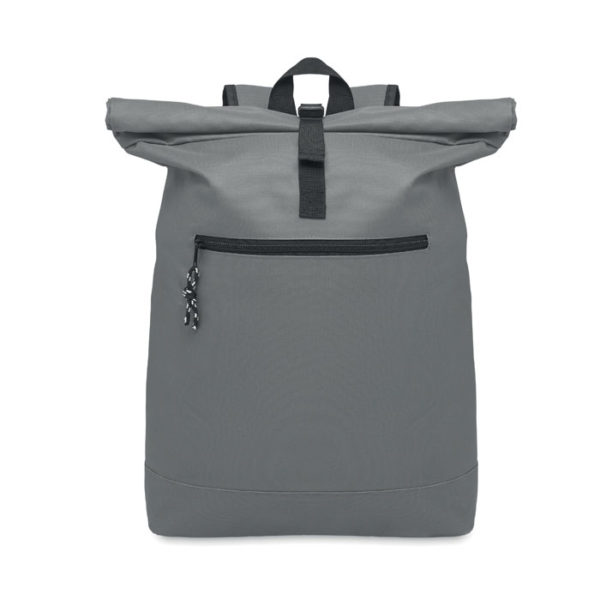 15 inch rolltop laptop backpack in 600D polyester with padded back and base reinforcement. Zippered front pocket. 210D lining.