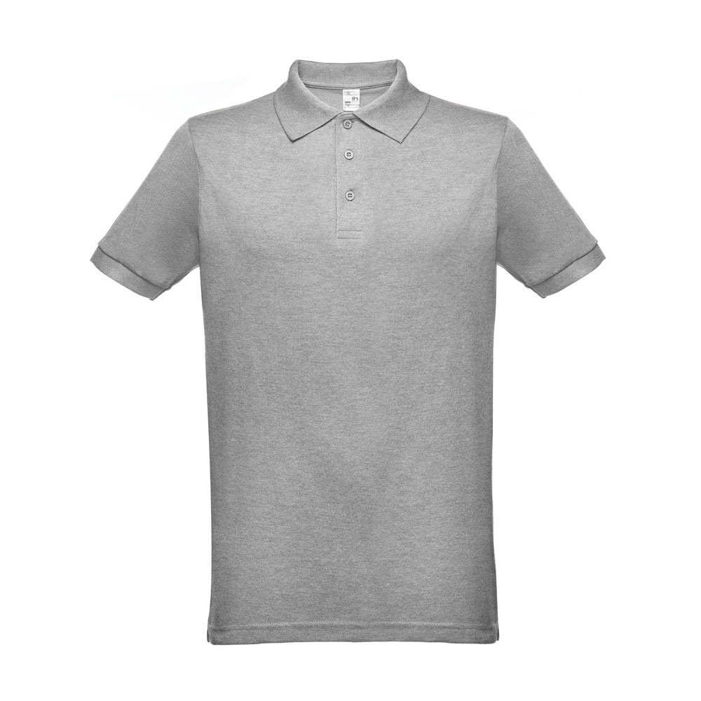 Short sleeve polo shirt for men in piqué mesh 35% carded cotton and 65% polyester (200 g/m²). Colour 183: 85% cotton/15% viscose. Regular cut polo with rib collar and sleeves, the collar being reinforced with piqué knit ribbon. Features a reinforced collar with 3 matching colour buttons (extra button inserted in the inner seam). Piece cut and sewn. Sizes: XS, S, M, L, XL, XXL