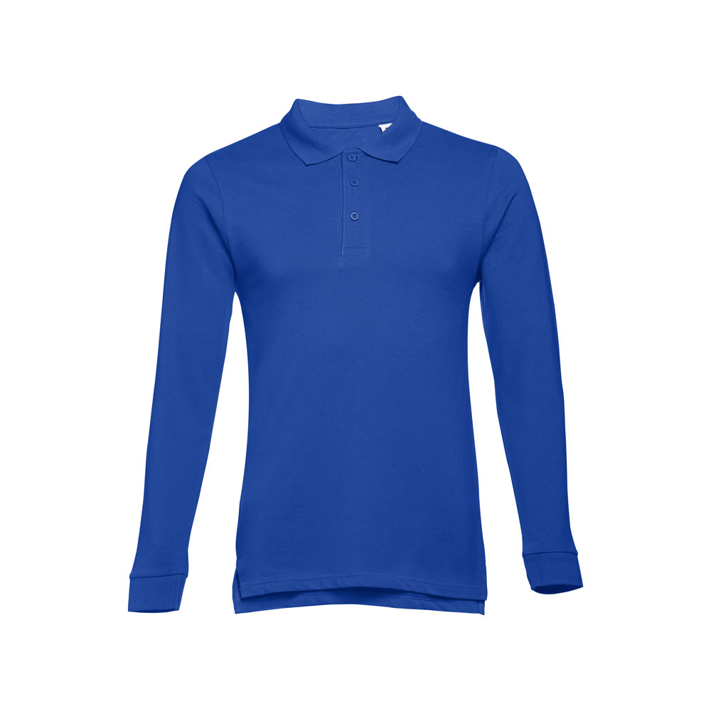 Long-sleeved polo for men in piqué 100% carded cotton (210 g/m²) (colour 183: 85% cotton/15% viscose). Regular cut polo with rib collar and cuffs, the collar being reinforced with piqué knit ribbon. Contains a reinforced collar with 3 matching colour buttons (extra button inserted in the inner seam). Piece cut and sewn with side vents at the hem. The visible label is removable. Sizes: S, M, L, XL, XXL