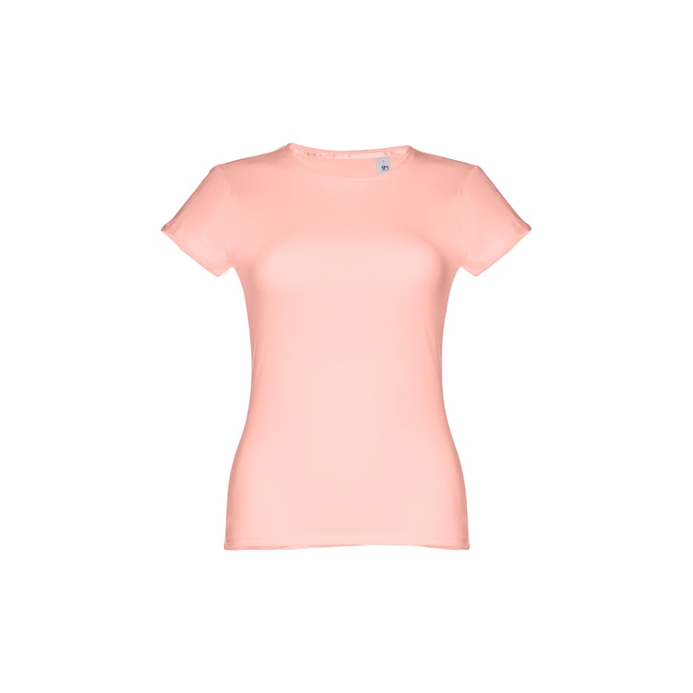 Women’s fitted T-shirt in 100% cotton jersey knit (150 g/m²) with carded cotton yarn (colour 183: 90% cotton/10% viscose, colour 196: 98% cotton/2% viscose). Features a thin double collar in jersey reinforced by a satin bias tape. Cut and sewn garment with double stitched sleeve and hemline. Sizes: S, M, L, XL, XXL