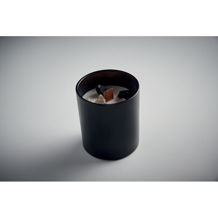 Vanilla fragranced plant based wax candle in glass with stones and wooden wick. 200 gr. Burn time: 20 hours.