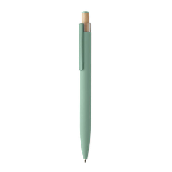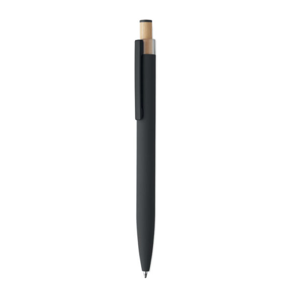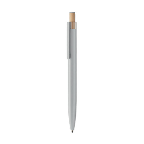 Recycled aluminium push ball pen with bamboo button with matching colour detail and matching metal clip. Blue ink.