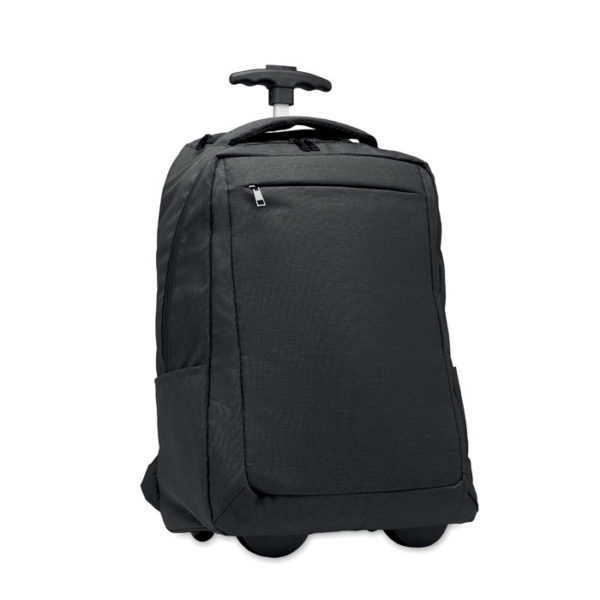 Laptop backpack trolley with wheels in 600D RPET polyester. Includes one internal 15 inch laptop compartment. Zippered front pocket. Two side slip pockets. Three inner slip pockets. Padded back and shoulder straps. 2 wheels and double tube frame.