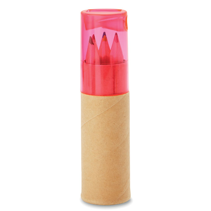 6 piece colouring pencils in tube. Pencil sharpener transparent lid.