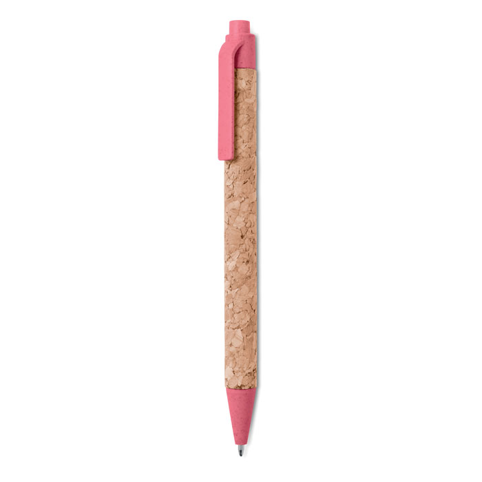Push button ball pen with cork barrel and Eco-friendly wheat straw (50%) and ABS plastic (50%) fittings. Blue ink. Cork is a natural material, due to its structural nature and surface porosity the final print result per item may have deviations.