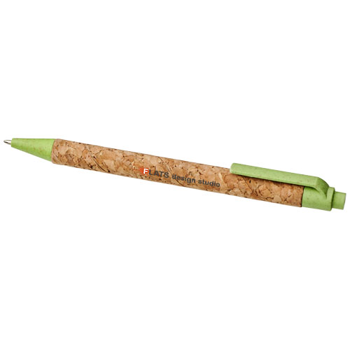 Eco friendly ballpoint pen with click action mechanism, with a barrel made of cork, and wheat straw trims that comes in a variety of colours. Wheat straw is left over stalk after wheat grains are harvested. This reduces the amount of plastic used, providing an Eco friendly alternative. The colour of the cork material may vary.