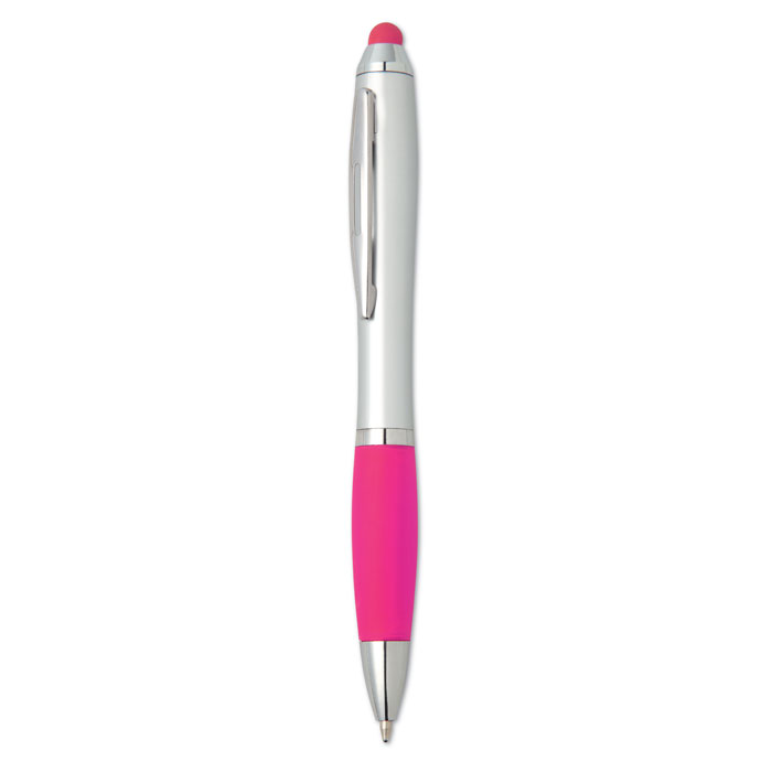 Twist action ball pen in ABS with stylus soft grip and matching tip. Blue ink