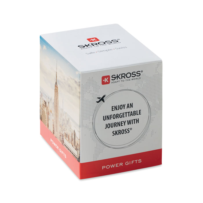 Universal SKROSS® travel adapter. Receptacles for Europe, USA/Japan, Australia/China. 2-pole, unearthed. Fulfils all international security-relevant standards and norms. Even child safe.