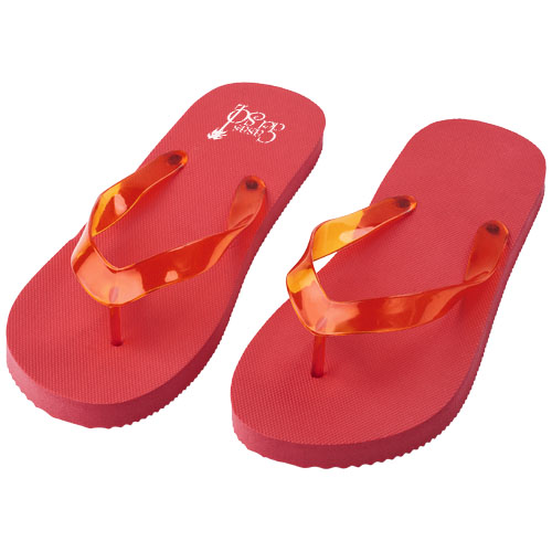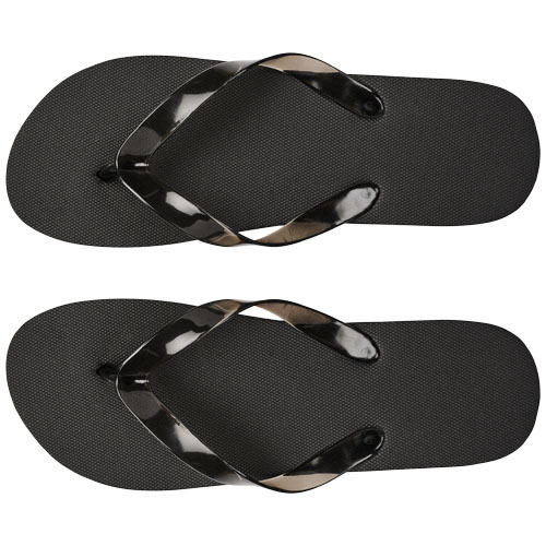 Set of comfortable beach slippers in a wide range of colours with polyethylene sole and PVC strap. Supplied in two different sizes: M 36-38 and L: 42-44.This is a proven give-a-way during summer season. Due to nature and usage of the product any applied logo is exposed to wear and tear.